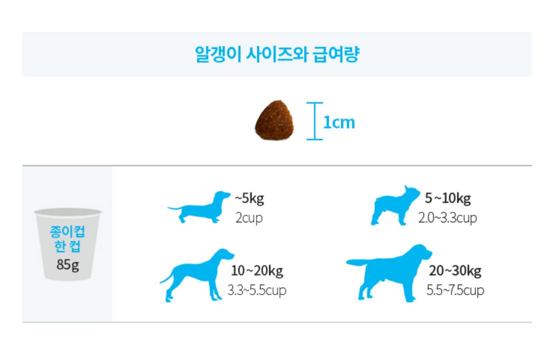 5키로 이하 반려견에게는 2컵 / 5키로~10키로 : 2컵에서 3.3컵